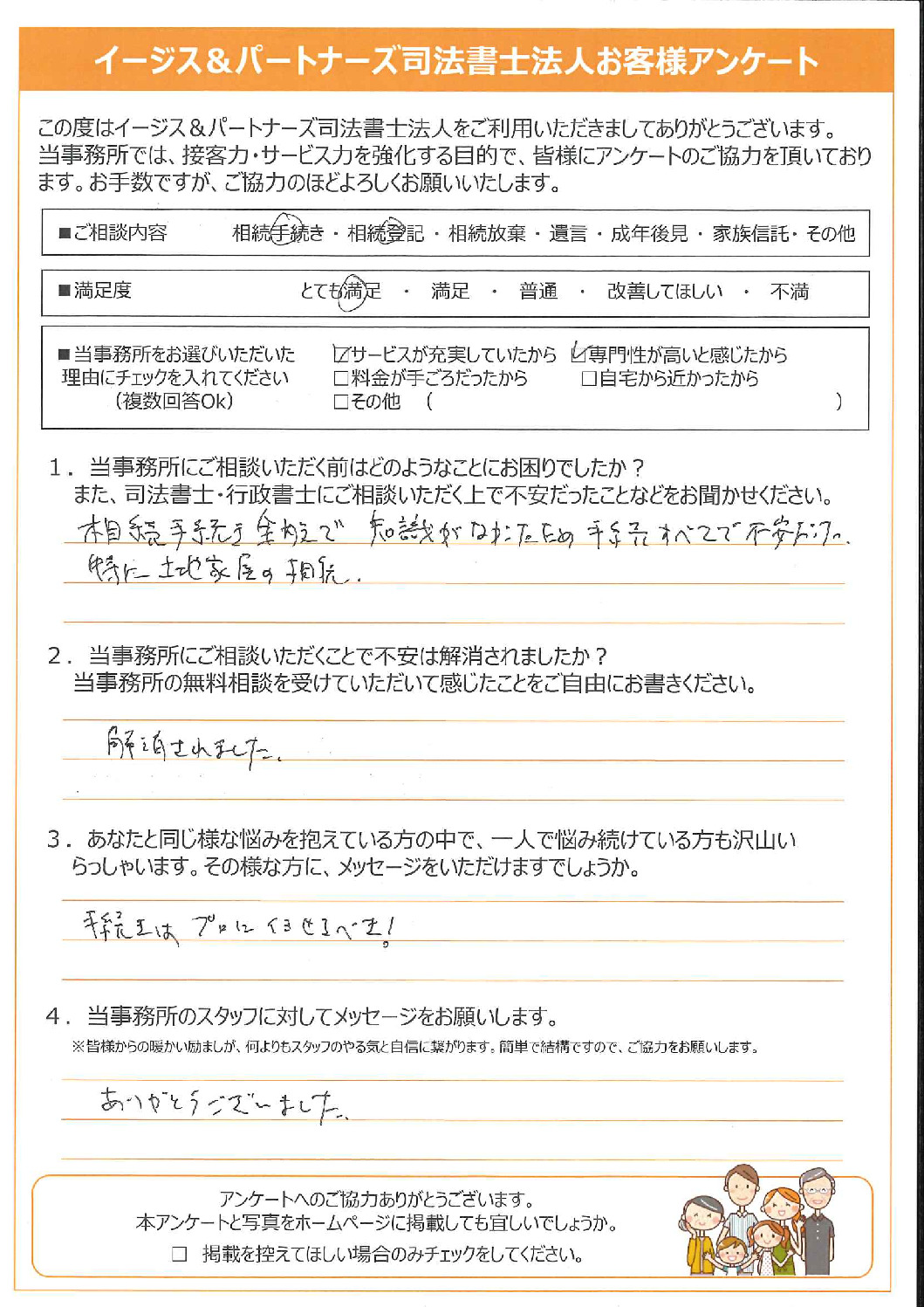相続手続き全般で知識がなかったため手続きすべてで不安だった。特に土地家屋の相続。